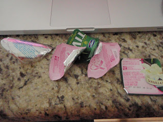 Why? Well, because I asked him too. After his morning Activia he rinses off the lids and sets them on the ledge to dry. After a few of them accumulate I collect them up and take them over to my laptop.